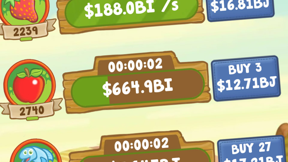 Eine weitere Hilfe für das Spiel finden Sie in der blauen Schaltfläche oben rechts, in der Sie auswählen können, wie viele Aktiva Sie gleichzeitig kaufen möchten. Anstatt eine Ziege zu kaufen, können Sie z.B 100 auf einmal kaufen, wenn Sie es sich leisten können. Jedes Mal, wenn Sie auf die blaue Schaltfläche klicken, ändert sich Ihre Einstellung für die Anzahl, die Sie auf einmal kaufen, zwischen "1", "10", "50", "100", "Max" und ein grünes Häckchen. Mit der "Max" Einstellung kaufen Sie sich Alles, was Sie sich leisten können, und das grüne Häkchen bedeutet "bis zum nächsten Meilenstein kaufen".