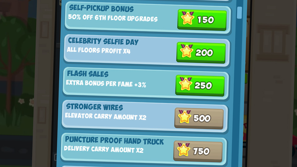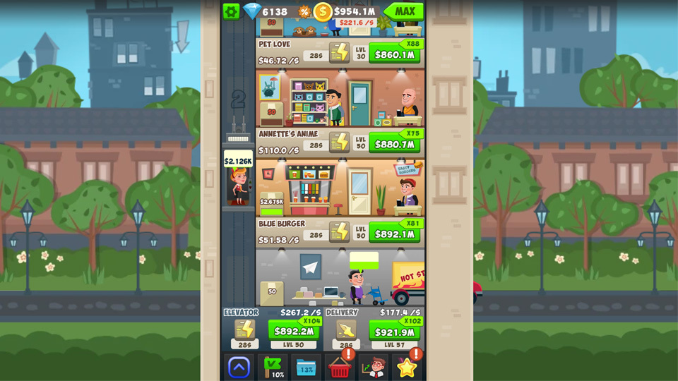 Die Manager erledigen die triviale Arbeit für Sie, so dass Sie sich auf das Upgraden der verschiedenen Stockwerke konzentrieren können. Ihre Manager geben Ihnen auch die Möglichkeit, einen Boost zu aktivieren, welcher das Stockwerk für eine Zeitlang noch besser funktionieren lässt.